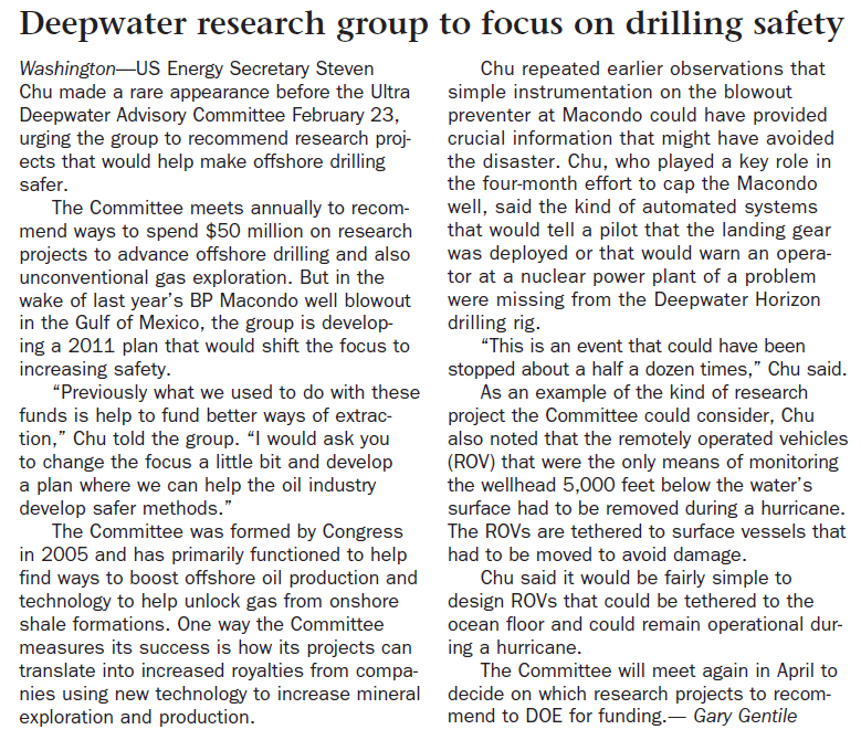Posted in accidents, drilling, Offshore Energy - General, well control incidents, tagged DOE, drilling, macondo, safety, Secretary Chu, Ultra-Deepwater, well control on February 24, 2011| Leave a Comment »
