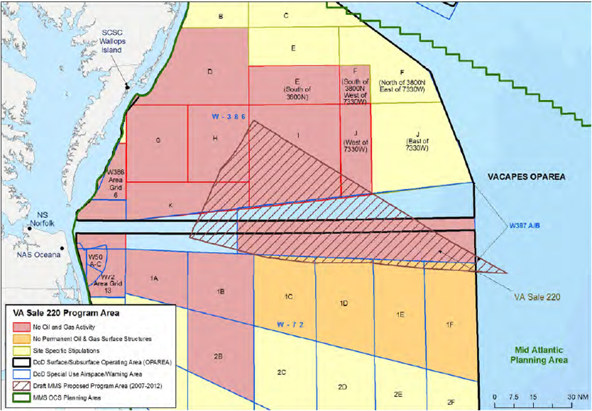 …but the only Atlantic area included in the present 5-year oil and gas leasing program is the cross-hatched wedge in the map below. This area was to have been considered for leasing in Sale 220, but the sale was cancelled following the blowout. The House Natural Resources Committee has passed legislation that would require that sale to be held.