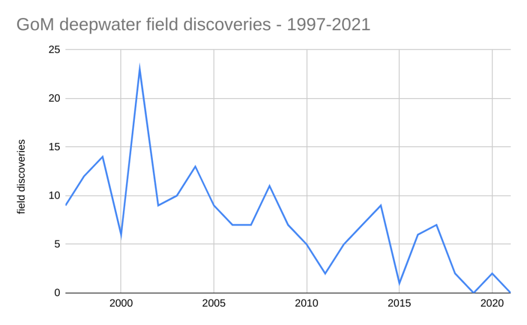 You can’t make discoveries without drilling and only 9 companies drilled deepwater GoM exploratory wells in 2021 (34 wells total). With the Pacific in decommissioning mode, the Atlantic and Eastern GoM off-limits, limited options offshore Alaska, and the decline of the GoM shelf, the deepwater GoM is the only important US offshore production option. The exploration numbers below are therefore concerning.