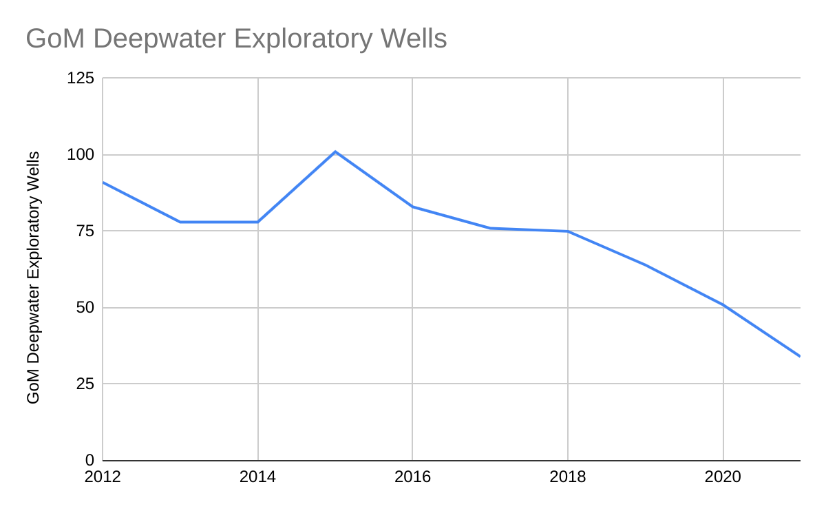 You can’t make discoveries without drilling and only 9 companies drilled deepwater GoM exploratory wells in 2021 (34 wells total). With the Pacific in decommissioning mode, the Atlantic and Eastern GoM off-limits, limited options offshore Alaska, and the decline of the GoM shelf, the deepwater GoM is the only important US offshore production option. The exploration numbers below are therefore concerning.