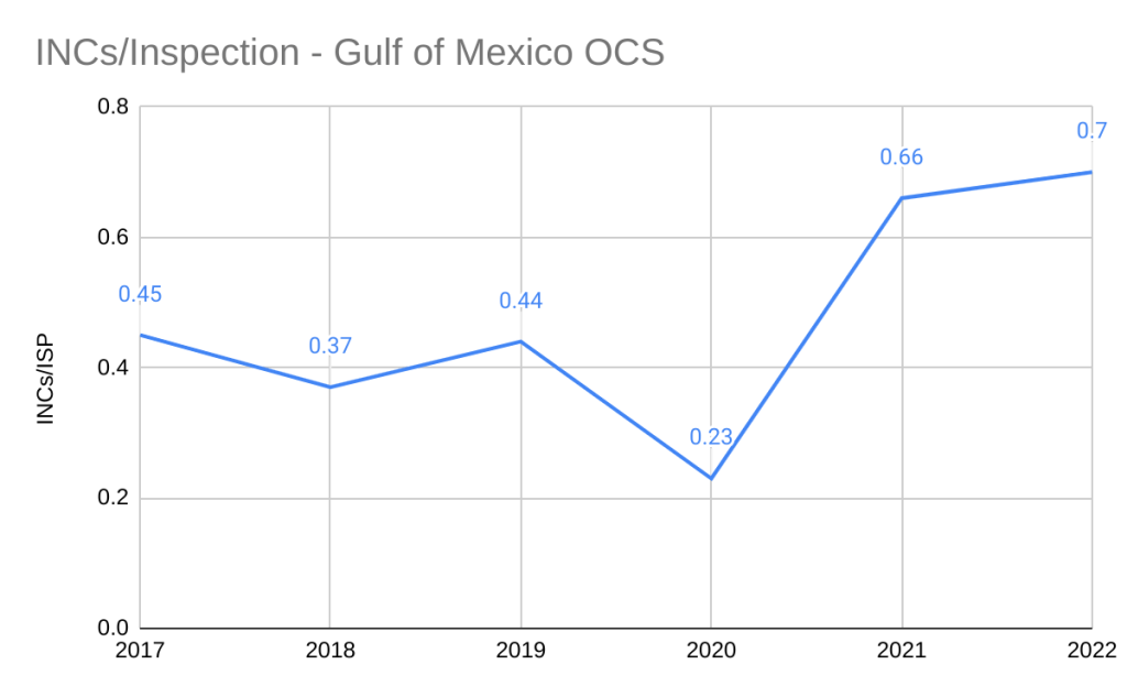 Per BSEE’s online Incident of Non-Compliance (INC) data, 4 operating companies accounted for 64% of the INCs during Q1 of 2022 (see chart below). Fieldwood was once again cited for the most INCs (132), but GOM Shelf LLC had the highest INC/inspection ratio (1.53). All 55 of the Whitney Oil & Gas INCs resulted in Facility Shut-In orders. Whitney was cited for failing to comply with damage inspection and records requirements following Hurricane Ida.