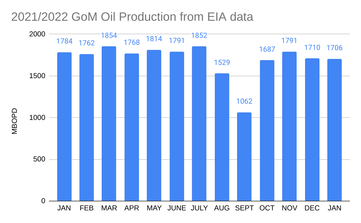 The short-term forecast doesn’t say how much of that production will come from the Gulf of Mexico. Last year, EIA forecast 2022 Gulf production to average 1.75 BOPD which seems about right based on the the most recent production data.