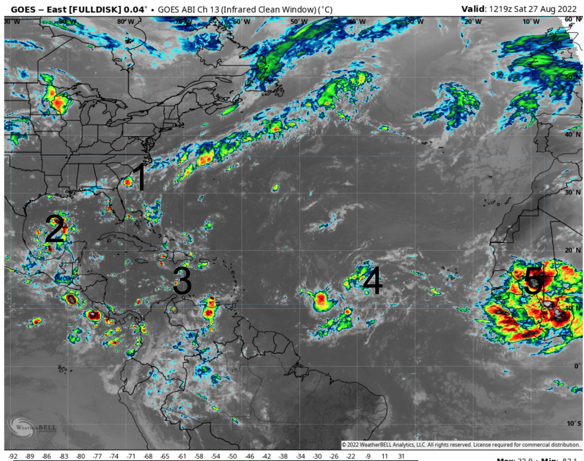 I fully expect feature number 4 to be a TC by Wednesday and Hurricane by Friday as it threatens the NE Caribbean first. Eventual track toward Bahamas SE US in 10-15 day period. Feature in Africa develops, stays way out. 1,2,3 weaker right now