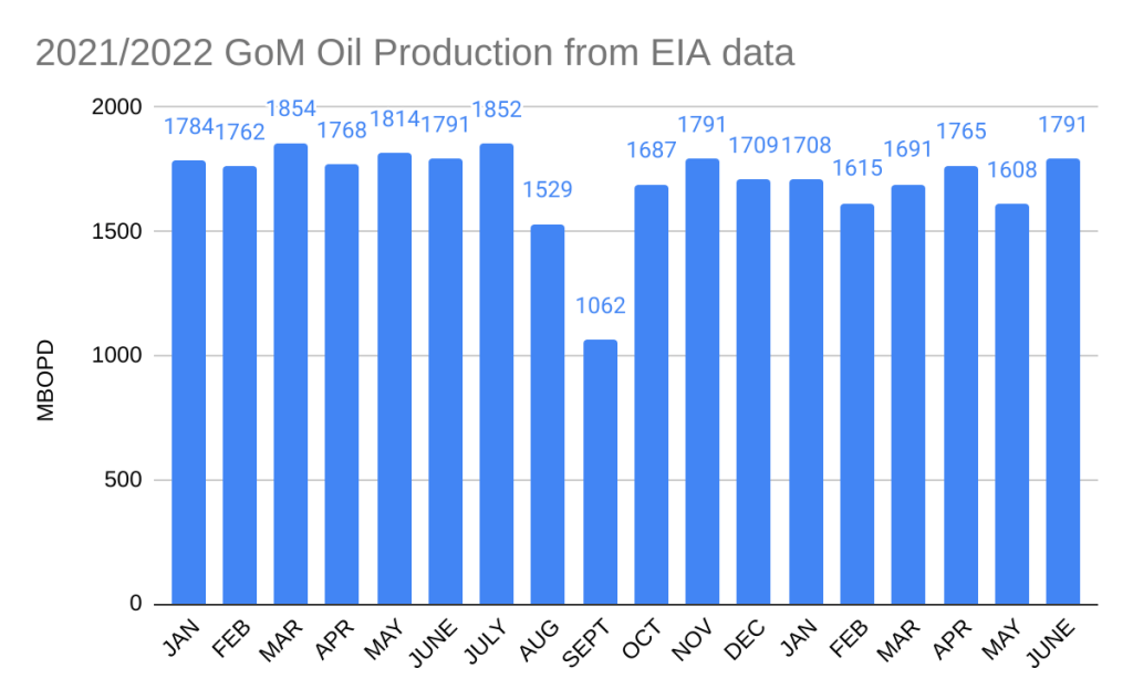 GoM oil production for June increased (see chart below) with King’s Quay and Spruance contributing to the uptick. Other anticipated 2022 startups are not yet producing.