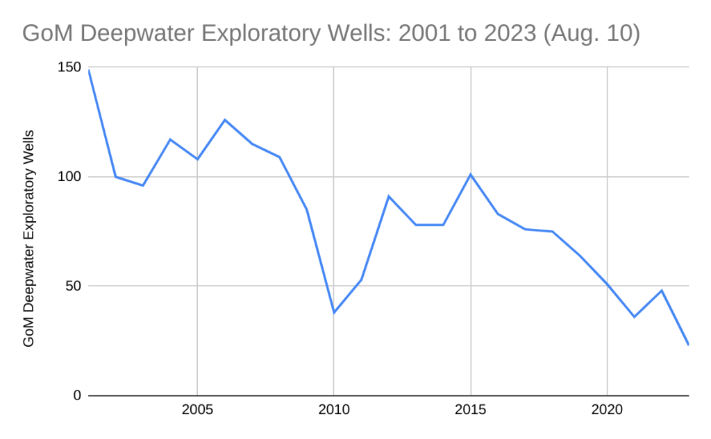 Record low exploratory drilling: 2023 will be the third consecutive year with fewer than 50 deepwater exploratory well starts. The only other year this century with <50 deepwater exploratory well starts was 2010 when there was a post-Macondo drilling moratorium.