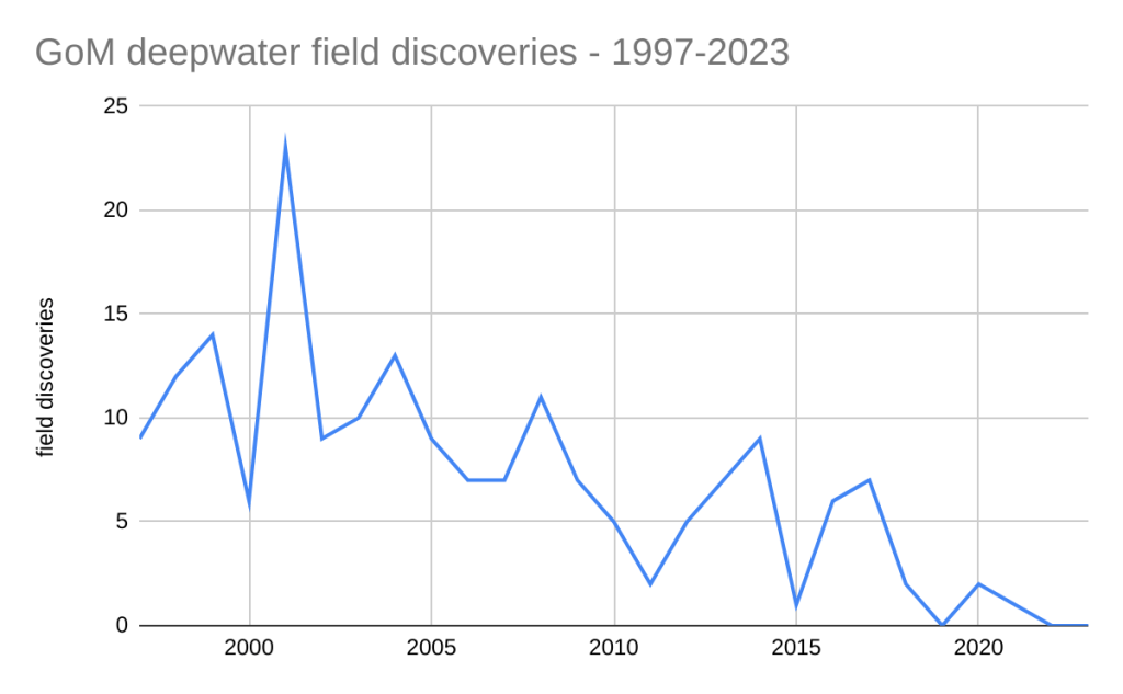 Absence of new field discoveries: Per BOEM’s database, no deepwater fields have been discovered since March 2021 and there were only 3 discoveries in the past 5 years (see chart below)