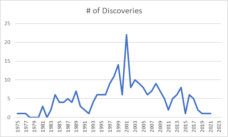 These are official USGS, MMS, and BOEM data (depending on the era) for field discoveries in >1000′ of water. Note that the last discovery was in March 2021.