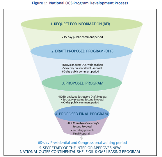 A leaked Dept. of the Interior (DOI) document will likely have little in common with the Draft Proposed Program (DPP, step 2 above). The DPP decisions will be made by the President, not by DOI staffers or managers.