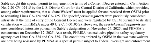 PHMSA was able to assume jurisdiction from the State because the pipeline transports Federal OCS oil and is thus inherently interstate. The perceived problem with a PHMSA takeover had been the court approved Consent Decree that was executed following the 2015 Refugio pipeline spill. That Decree specifies that the State Fire Marshal must approve a restart of the pipeline. The first paragraph on p. 2 of the permit explains PHMSA’s position that the Consent Decree has been superseded.