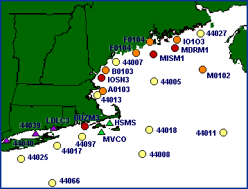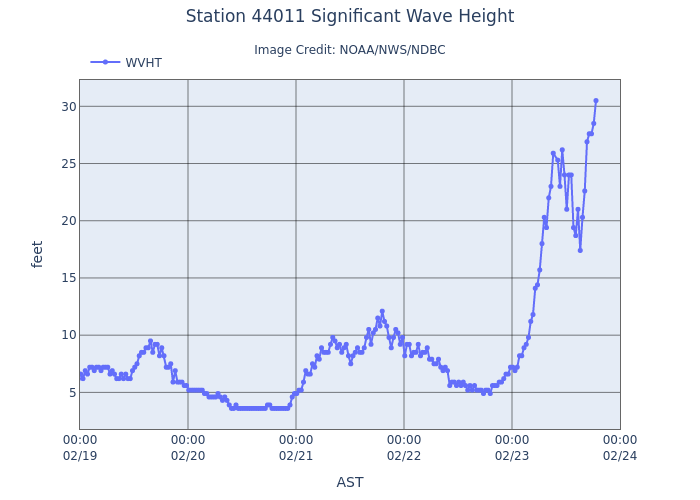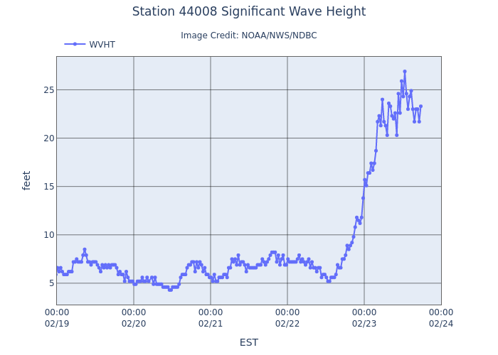 The wave data are from Georges Bank (buoy 44011, first chart) and Nantucket Shoals (buoy 44008, second chart).