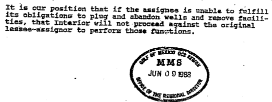 Prior to the that rule, the official policy of the Dept. of the Interior, as expressed in a 1988 letter from the Director of the Minerals Management Service (see excerpt pasted below), was that lease assignors would NOT be held accountable should their successors fail to fulfill their decommissioning responsibilities.