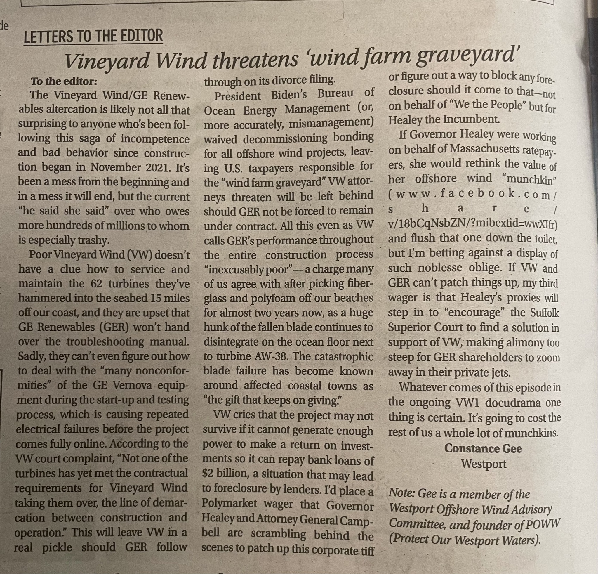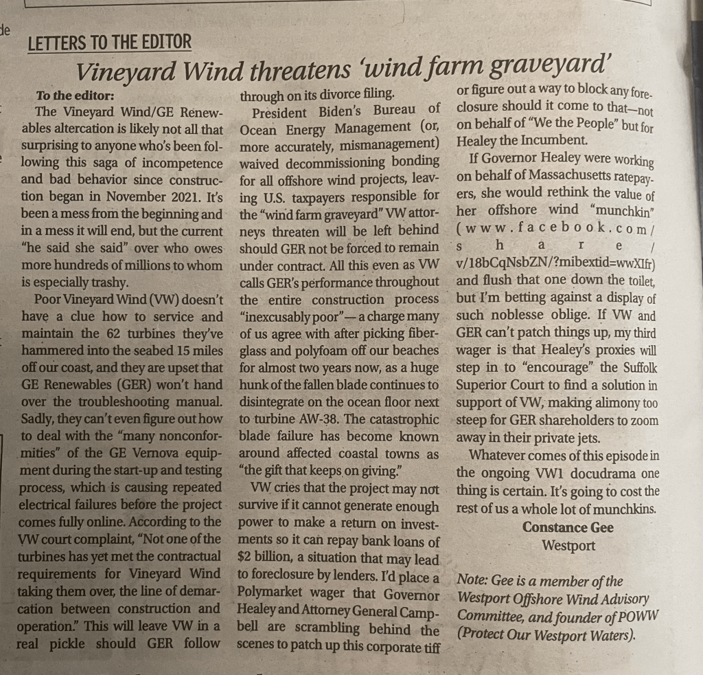 The Constance Gee letter (pasted below) is entertaining no matter where you stand on the Vineyard Wind debacle. A couple of quotes 😉: