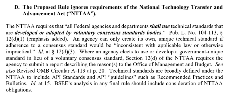 The comment (pasted below) by the trade associations asserts that BSEE ignored the requirements of the National Technology Transfer and Advancement Act (NTTAA).