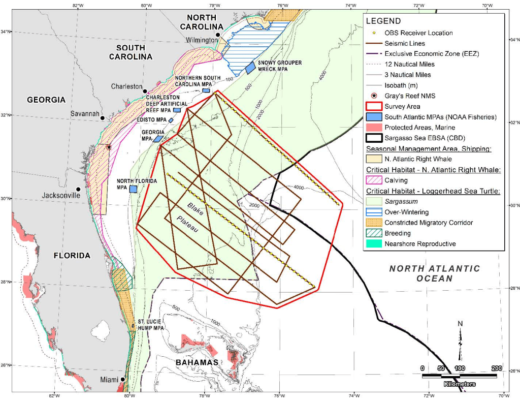 Just as I was lamenting the absence of scientific surveying in the Atlantic, my former colleague Renee Orr brought this NOAA announcement to my attention. Researchers from the University of Texas Institute of Geophysics and Lamont-Doherty Earth Observatory, with funding from the National Science Foundation, propose to conduct seismic surveys in the Blake Plateau area of the South Atlantic (map below).