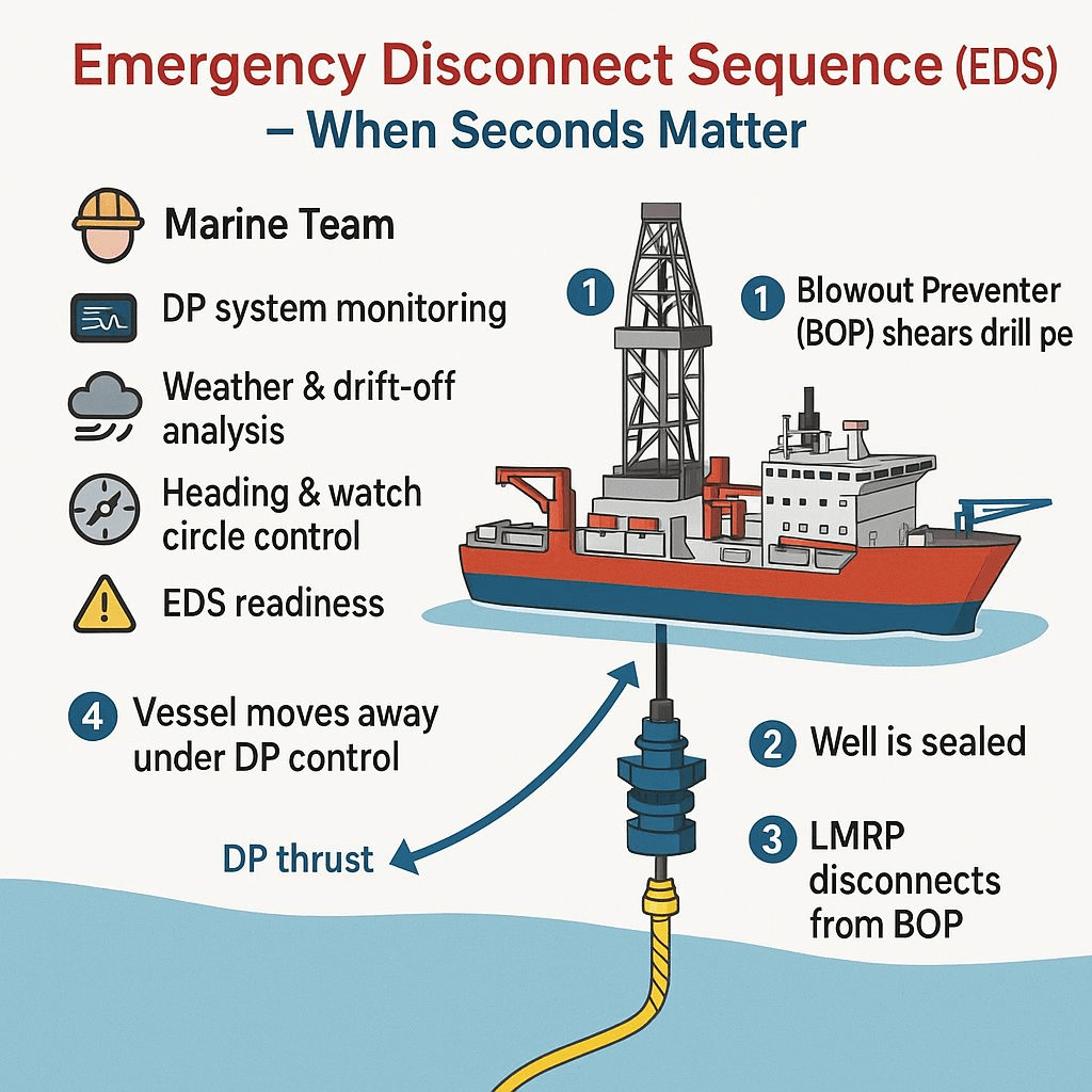 The EDS (see the diagram above) is a critically important safety protocol that ensures that a well is sealed and the riser and rig are disconnected from the blowout preventer in the event of a well control emergency, unforeseen weather/ocean conditions, loss of power, or positioning system malfunction. Note that the Macondo blowout could have been prevented if the Deepwater Horizon crew had activated the EDS in a timely manner.