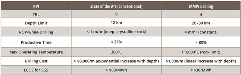 Good comparison of drilling into hard basement rock with conventional and millimeter wave (microwave) technologies: