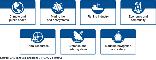 The Government Accountability Office report on Offshore Wind Energy (full report attached) does a good job of summarizing the potential impacts from offshore wind development. They are categorized in the report as follows:
