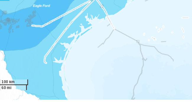 Deepwater gas gathering system connects with Brazos 538 transmission platform at the “Y” in the center of the screen.