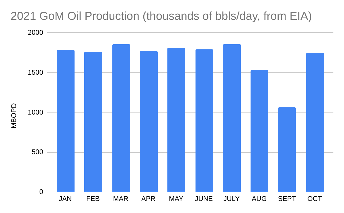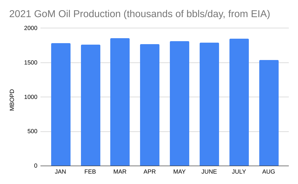 1.60 to 1.74 million BOPD were shut-in from 8/28 to 8/31, reducing the average daily production for August to 1.535 million barrels per day, a net reduction of 312,000 BOPD from July. The September production figure will be significantly lower given that more than half of the GoM production was shut-in for 13 days in September and several hundred thousand BOPD were shut-in for the rest of the month. September production will be released at the end of November.