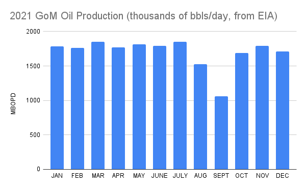 October production rebounded to 1.744 million BOPD from the 2021 low of 1.064 million BOPD in September (Hurricane Ida). November and December production should exceed 1.8 million BOPD.