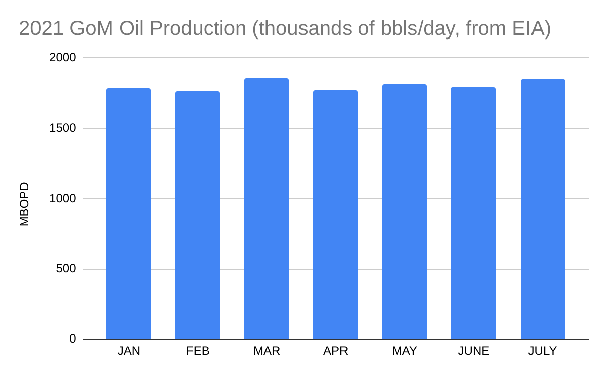 EIA just released the July data, and GoM oil production averaged 1.845 million BOPD, which was consistent with expectations. 2021 production through July was relatively stable averaging from 1.762 to 1.845 million BOPD. This will, of course, change dramatically when the August data are released, and even more so for September. Most production was shut-in for Ida beginning on 8/28 and some production has not yet been restored. Per BSEE’s final update (9/23), about 300,000 BOPD remained shut-in.