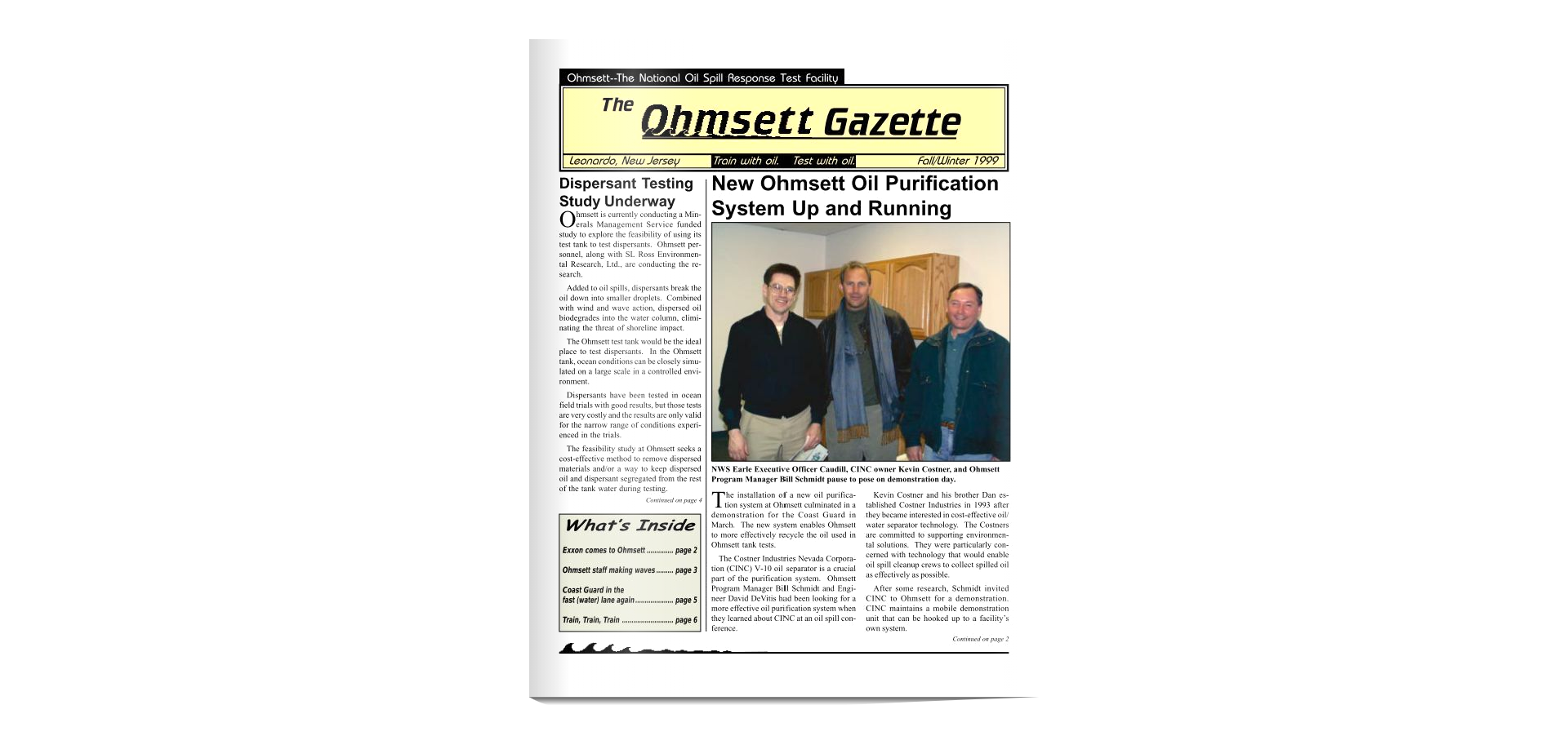 Among the many companies to test equipment at Ohmsett is one that was partially owned by actor Kevin Costner. See the article and photo below. If you build it (and maintain it), they will come!