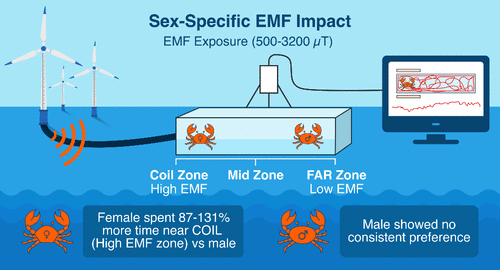 This study provides the first evidence that EMFs typical of SPCs elicit sex-specific behavioral responses in C. maenas. Females exhibited significantly greater attraction to EMF zones and avoidance of low-field zones, suggesting higher exposure risk. These differences could affect migration, mating, and larval release, with consequences for population dynamics.