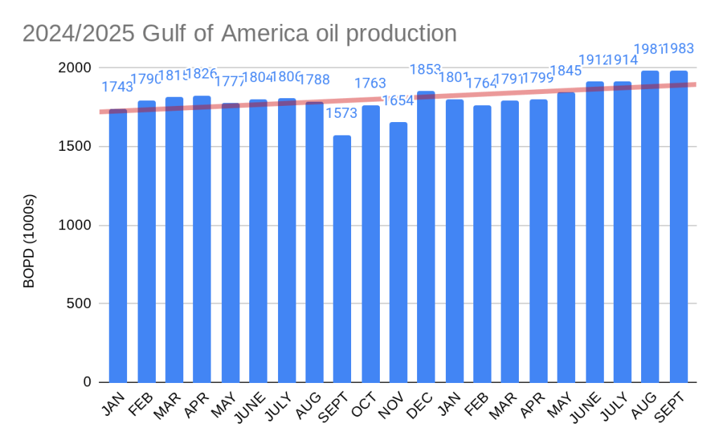 Per EIA, September Gulf of Mexico production averaged 2 million bopd on the button! New production from Vito and Argos were no doubt contributors, as production reached the 2 million bopd mark for only the third month in the history of the OCS program. The other 2 months were in 2019.