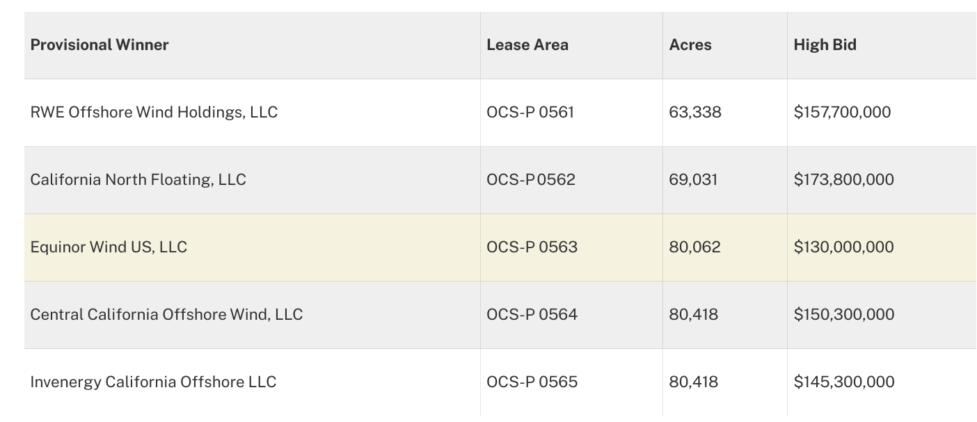 California offshore wind sale: 5 leases, $757.1 million in high bids
