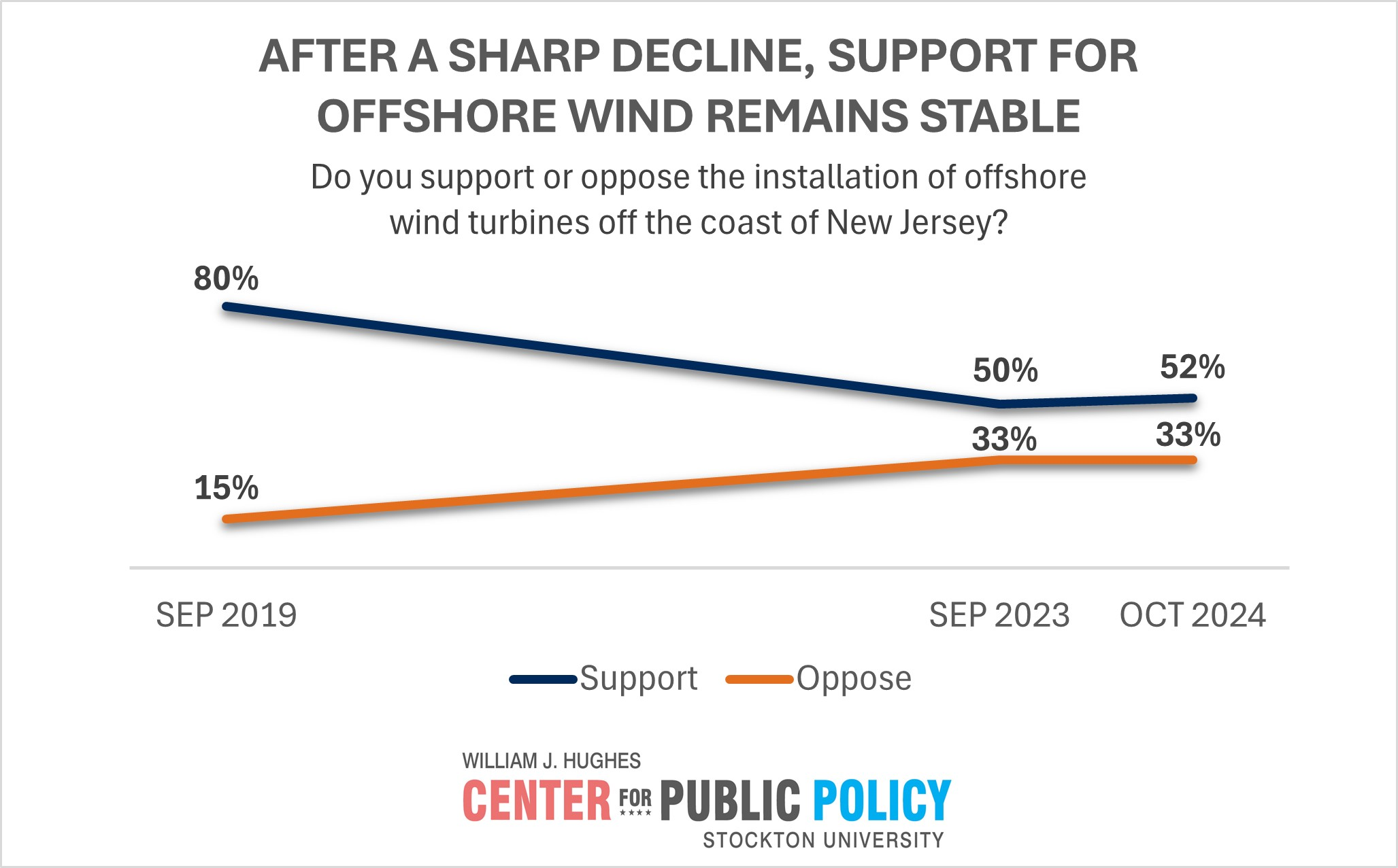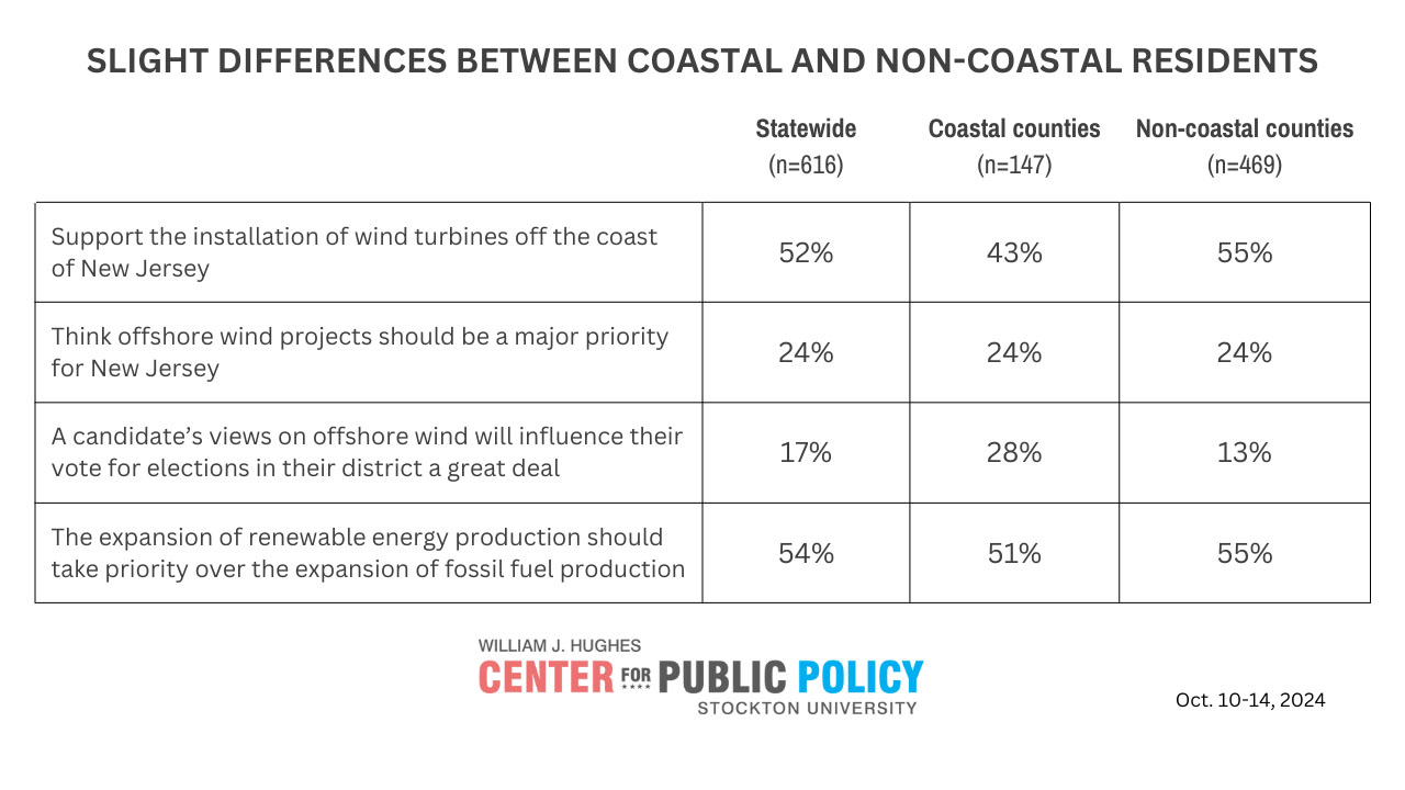 - The polling data suggest that offshore wind projects are not a priority for most New Jersey voters. Only 24% of both coastal and non-coastal residents view offshore wind as a major priority (third slide below).