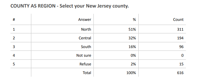 - More than half of the respondents were from North Jersey, the region that is more closely aligned politically with the Governor and the Federal Administration. Only 16% of the respondents were from South Jersey where opposition to offshore wind projects is the strongest. The imbalance is understandable in that it is consistent with the regional imbalance in population.