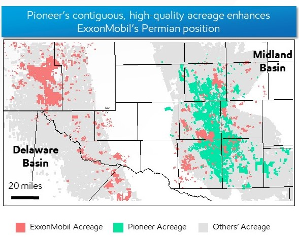 - Exxon has acquired Pioneer’s 850,000+ Permian acres, which increases their Permian holdings by approximately 150%.