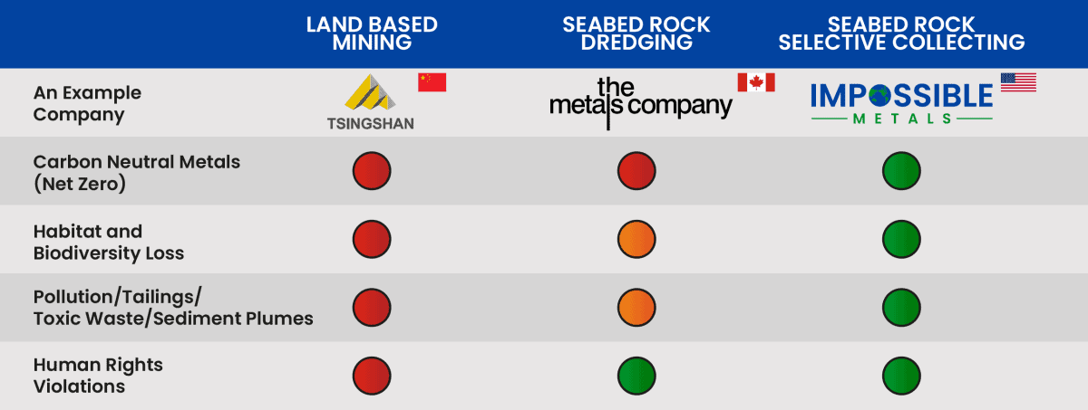 An Impossible Metals table (below) understandably favors their methods vs. those employed by deep-sea mining rival The Metals Company. However, both approaches are far preferable, environmentally and socially, to onshore metal mining.