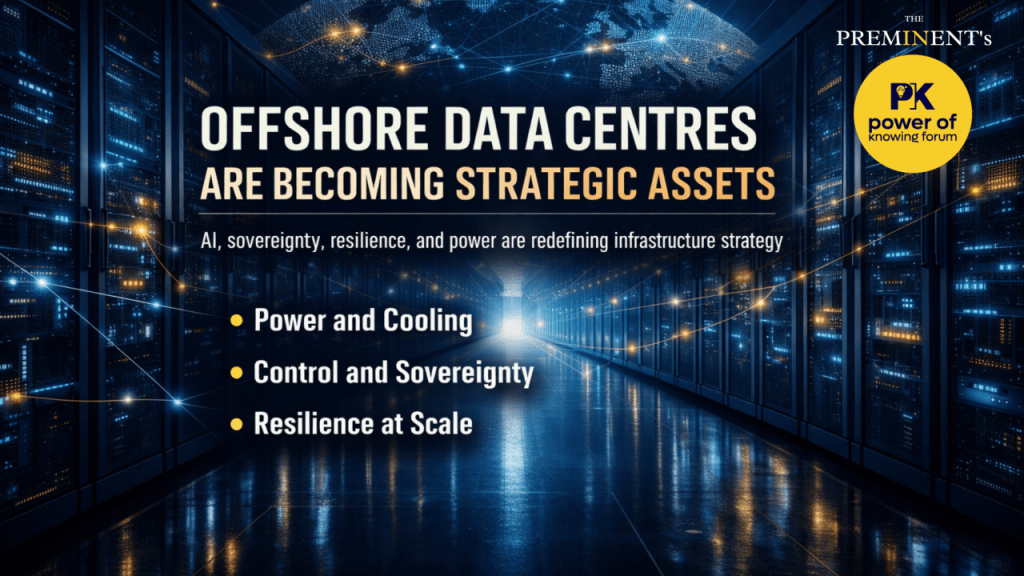 Advantages of offshore data centers include power availability (natural gas, hydro-kinetic, wind, solar), cooling water, sovereignty, and growth potential.