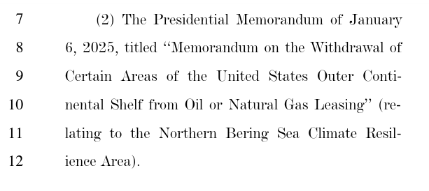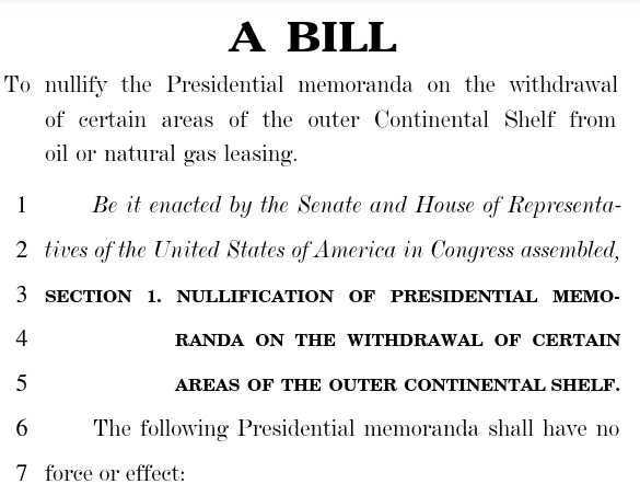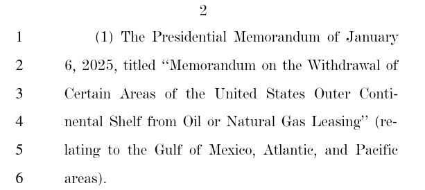 If the bill should pass, President Trump would presumably nullify his own Atlantic and Eastern Gulf withdrawals, which would otherwise remain in effect through 2032.