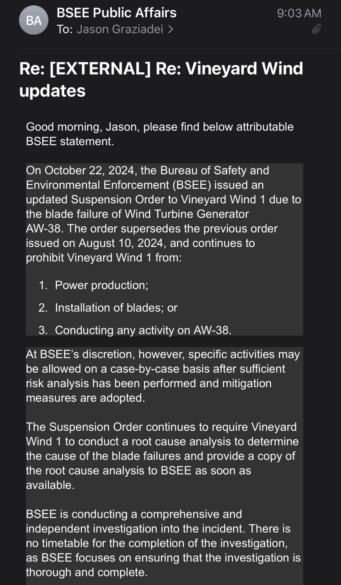 Nantucket reached a settlement agreement (attached) with turbine manufacturer GE Vernova (GEV), praising that company while criticizing Vineyard Wind (VW), the lessee and operator:
