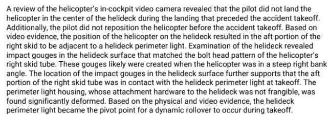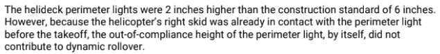 This is interesting wording given that the perimeter light was identified as the pivot point, one of the 3 requirements for a dynamic rollover. Why wasn’t that violation observed by the operator/contractor and corrected? What helideck inspection procedures were in place? Did NTSB consider the fragmented regulatory regime for helicopter safety, particularly with regard to helidecks?