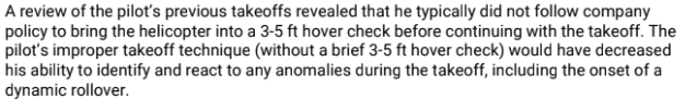 The report implies that human (pilot) error was the cause of the dynamic rollover, but fails to assess the organizational controls that are intended to prevent such errors. How was a pilot with 1667.8 flight hours (1343.8 as the PIC), who had made 23 trips to this platform, repeatedly making fundamental positioning and takeoff errors?