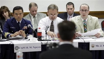 Capt. Hung Nguyen, David Dykes, and Jason Mathews question the witness. Sylvia Murphy and Kirk Malstrom monitor attentively from the 2nd row.