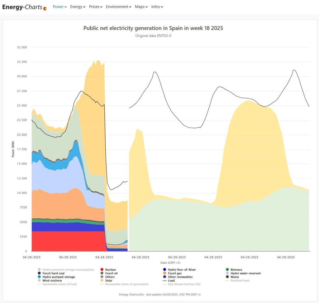 The massive power outage in Spain and Portugal on Monday may be the result of the opposite challenge – a surge in solar power supply greatly exceeding demand (dark line in chart below).