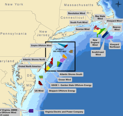 The suspended leases are for Vineyard Wind 1, Revolution Wind, Sunrise Wind, Empire Wind, and Coastal Virginia Offshore Wind. (See the map below).These are the only Atlantic Wind projects under construction.