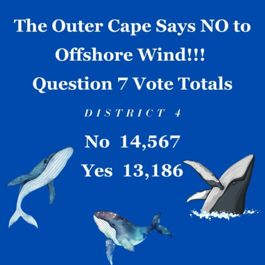 While nonbinding, the ballot initiative was intended to demonstrate support among Outer Cape residents for offshore wind development. However, perhaps unexpectedly, the initiative failed with 52.4% voting against (graphic below). It’s noteworthy that 82% of South Shore (Massachusetts) voters supported offshore wind development when a similar initiative was on the ballot in 2008. That’s a massive decline in support albeit in a different coastal area of the state.
