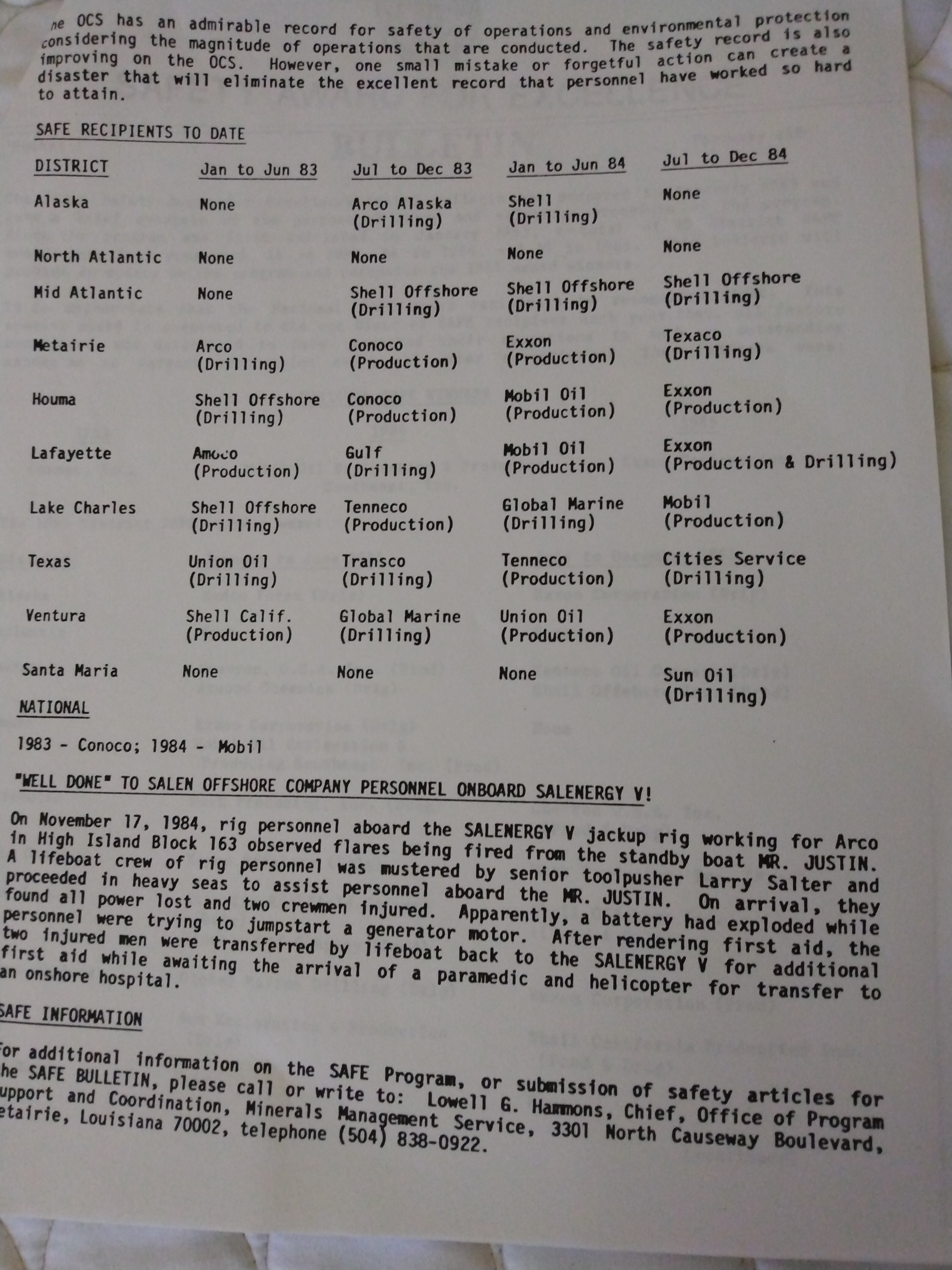 Attached is a list of the award winners for 1983 and 1984. Also note the recognition for the Salenergy jackup crew members who rescued injured and endangered personnel from a distressed vessel. Such heroism was not uncommon.