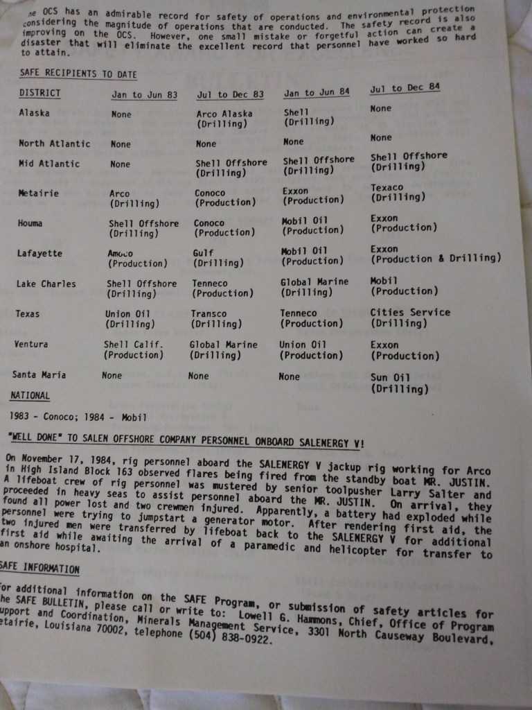 The Safety Award for Excellence (SAFE) program was initiated in 1983 by Lowell Hammons, a senior executive in the Minerals Management Service, the OCS safety regulator at the time. The objective was “to promote interest in and recognition of operational safety and environmental protection on the OCS.” In that regard, the program was highly effective.