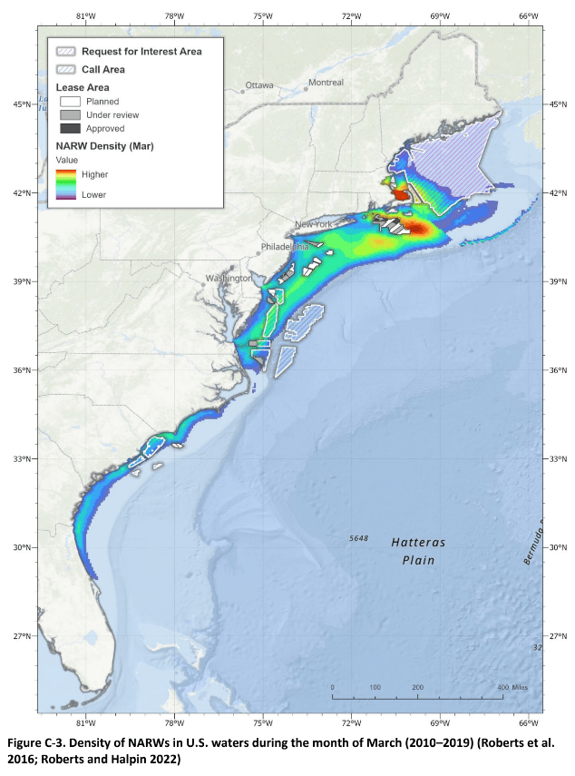 - (p.17): BOEM will “attempt to avoid issuing new leases in areas that may impact potential high-value habitat and/or high use areas for important life history functions such as NARW foraging, migrating, mating, or calving. For areas that are leased, permitting activities should minimize any known or potential threat to NARWs and their habitats, and developers and BOEM should support research and monitoring.”