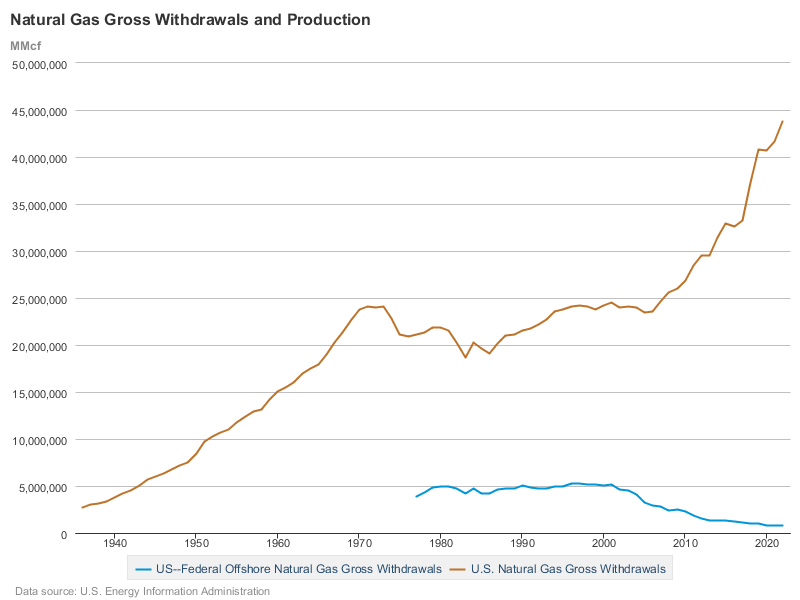 Natural gas is a different story, and Norway’s offshore gas production is much higher. US gas production (second chart below) has been dominated by the onshore sector since advances in horizontal drilling and well stimulation procedures triggered the shale gas revolution twenty years ago.