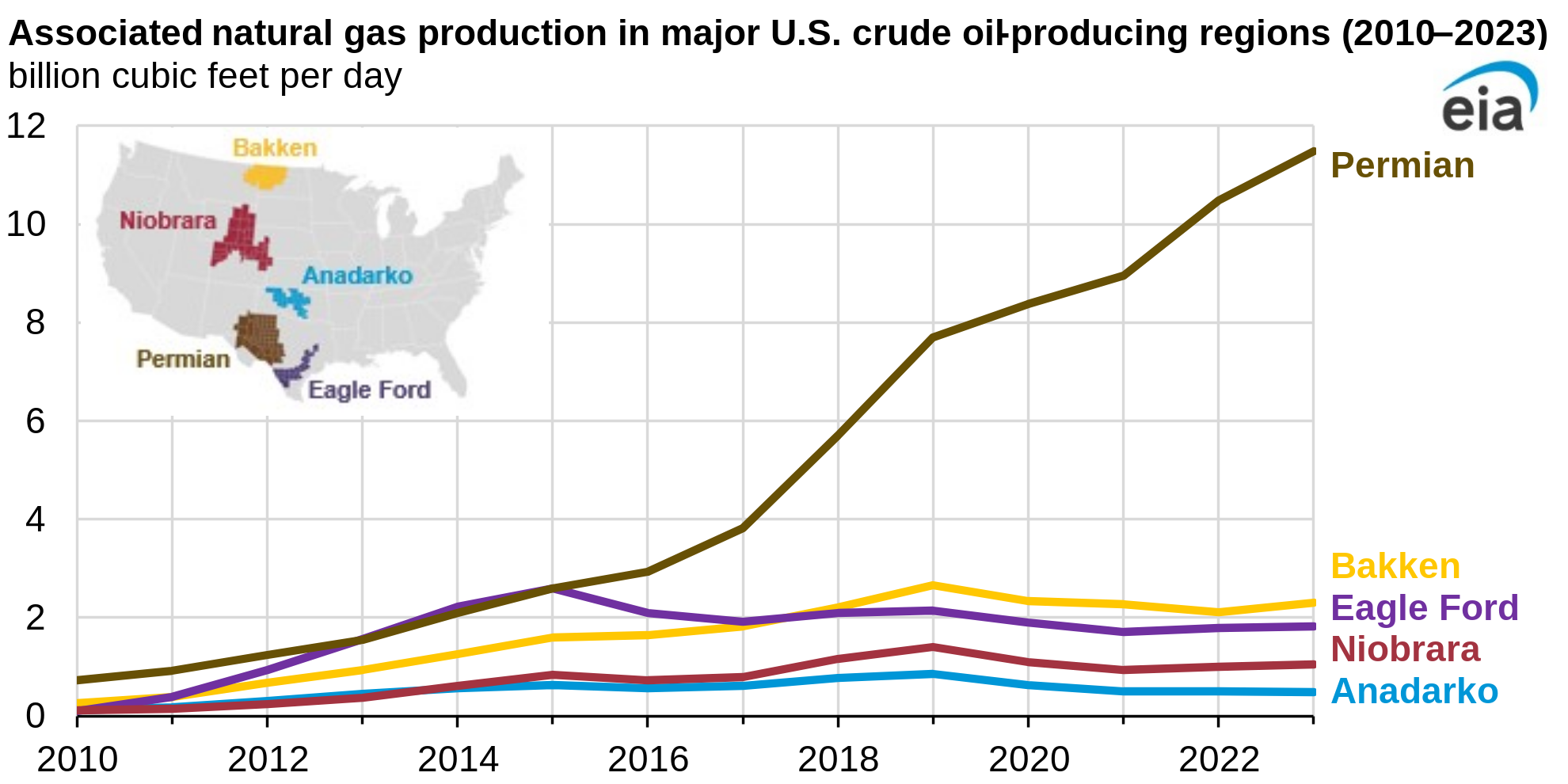 The EIA reports an 8% increase in 2023 US associated gas production as crude oil production rose to record levels. The Permian Basin, the dominant US crude oil producer, is unsurprisingly the leading associated gas producer.
