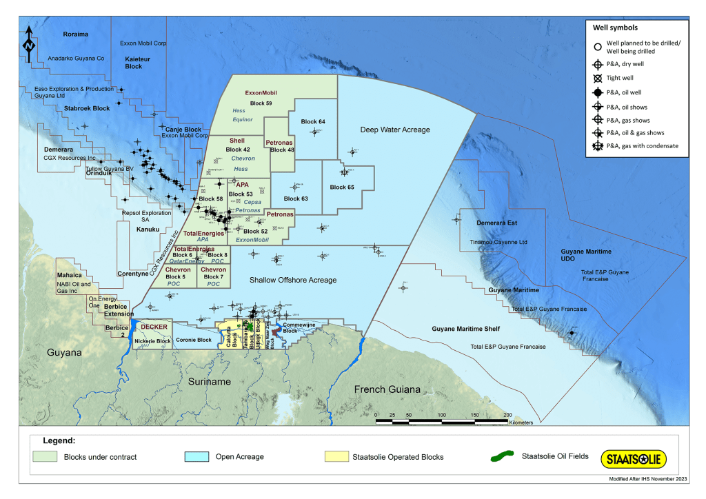 Through the PSCs, Staatsolie extends the rights for exploration, development and production to these companies. The costs and risks during the exploration period are fully covered by the latter. The exploration period consists of three phases and will last seven years. An exploration well will be drilled in both Block 64 and Block 65 in the first phase, which will last three years. In Block 63 the first exploration well follows in the second phase of the exploration period. In the event of an oil or gas discovery that is declared commercial, Staatsolie has the right to participate in all three blocks for a maximum of twenty percent from the development period