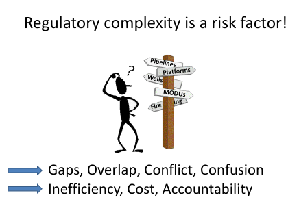 When multiple agencies have jurisdiction over a facility, system, or procedure, the redundancy inevitably results in inconsistency, ambiguity, and gaps in oversight. The focus of operating companies and contractors is diverted from safety and risk management to understanding and satisfying the regulators. The inevitable result is a compliance mentality that weakens the safety culture.