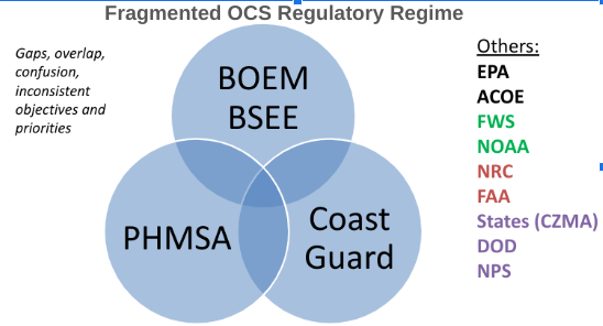 Regulatory fragmentation was a contributing factor to the two most fatal US OCS incidents in the past 35 years, the 2010 Macondo blowout and the South Pass 60 “B” fire and explosion in 1989.